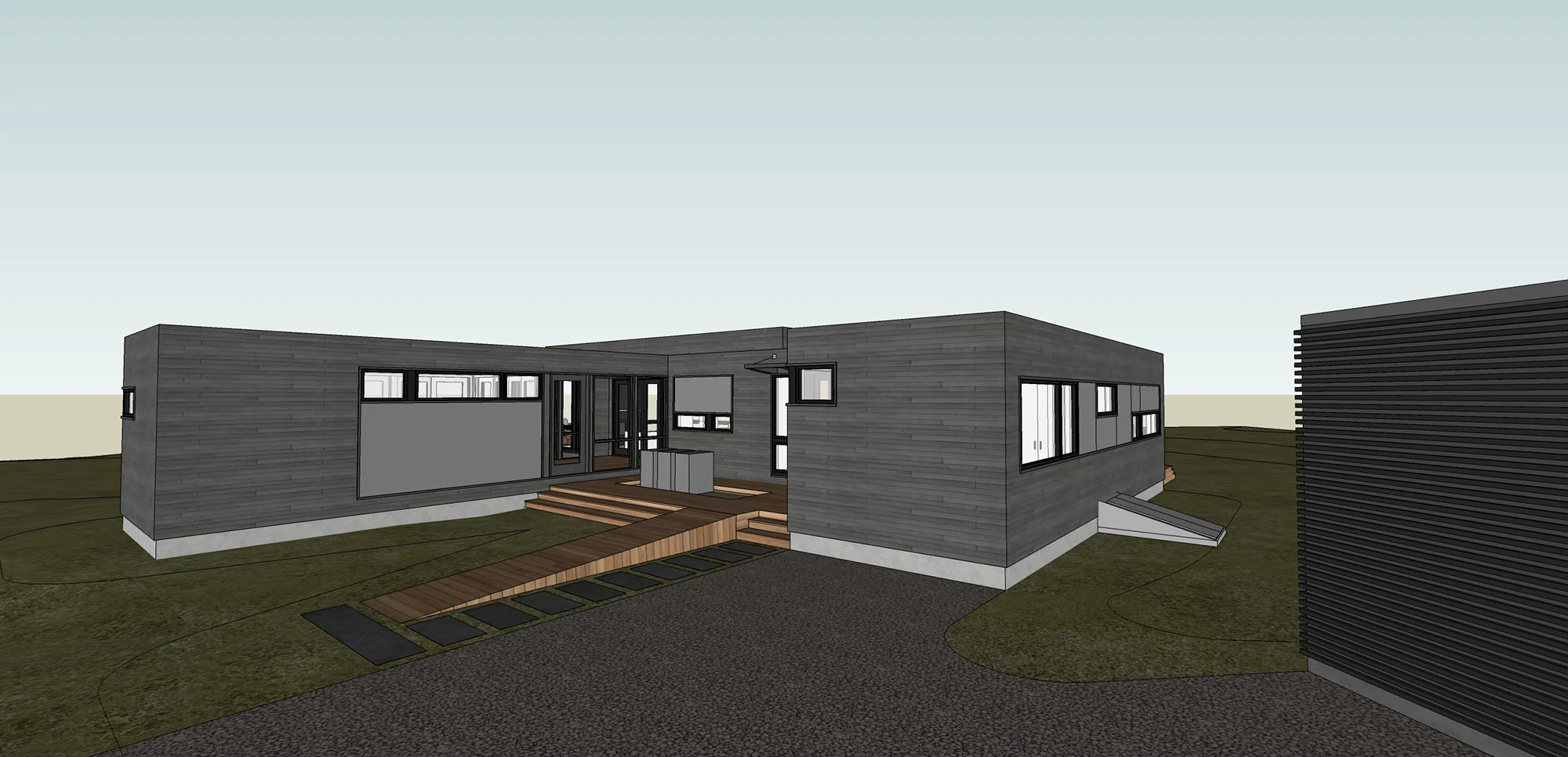 - Primary southern exposure with large sliding glass doors for natural daylighting and passive winter heating, with roof overhangs and brise soleils to mitigate excess solar heat gain during summers.