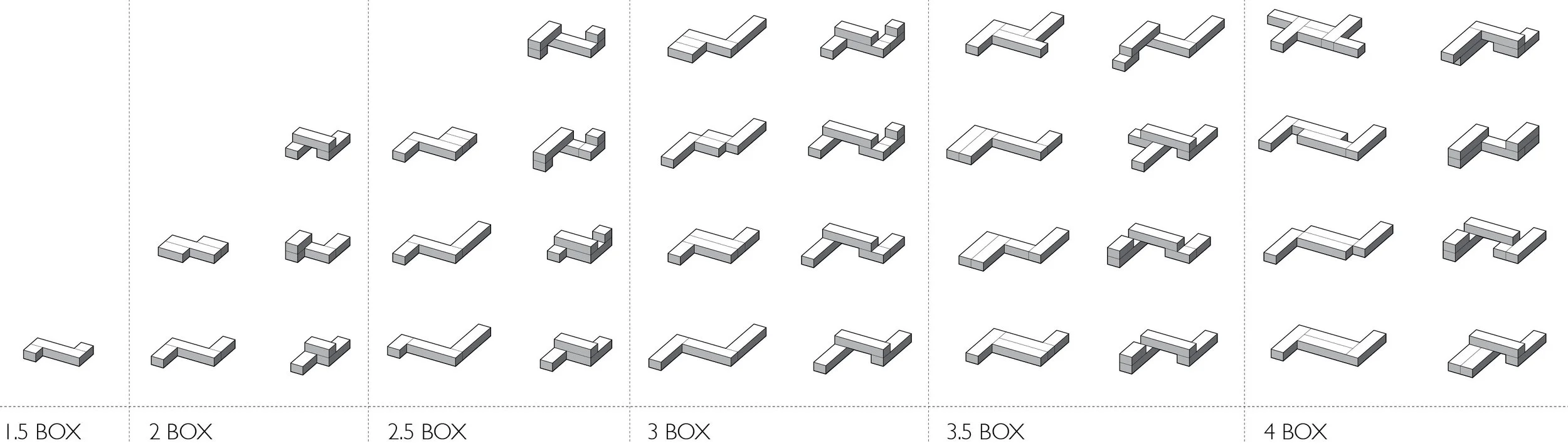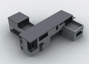 The 3-Bar Bridge creates an optimum division of space by forming a bridge connection between three modular living units. The ground floor is made up of a living / dining / kitchen unit separated by a covered drive from a two bedroom guest house which could alternatively be used as a convenient home office. Bridging the lower levels is another two-bedroom living unit with a centralized media room
