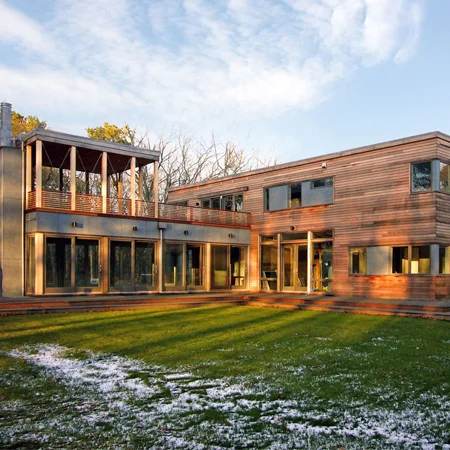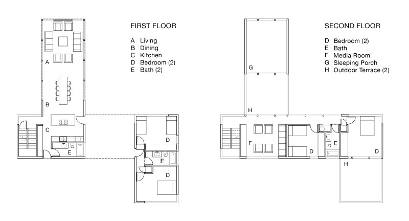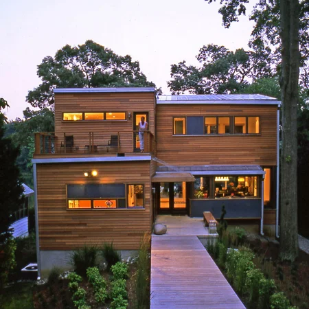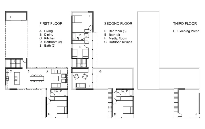 The 3-Bar Bridge with 3-story tower has a commanding presence on any site. Among the design’s most interesting features is a large sleeping porch with spectacular views at the third floor of the tower element. The house’s circulation is both convenient and unique, with master and guest bedrooms nestled in the tower connecting through a central living space on the first floor to another residential bar opposite of it.